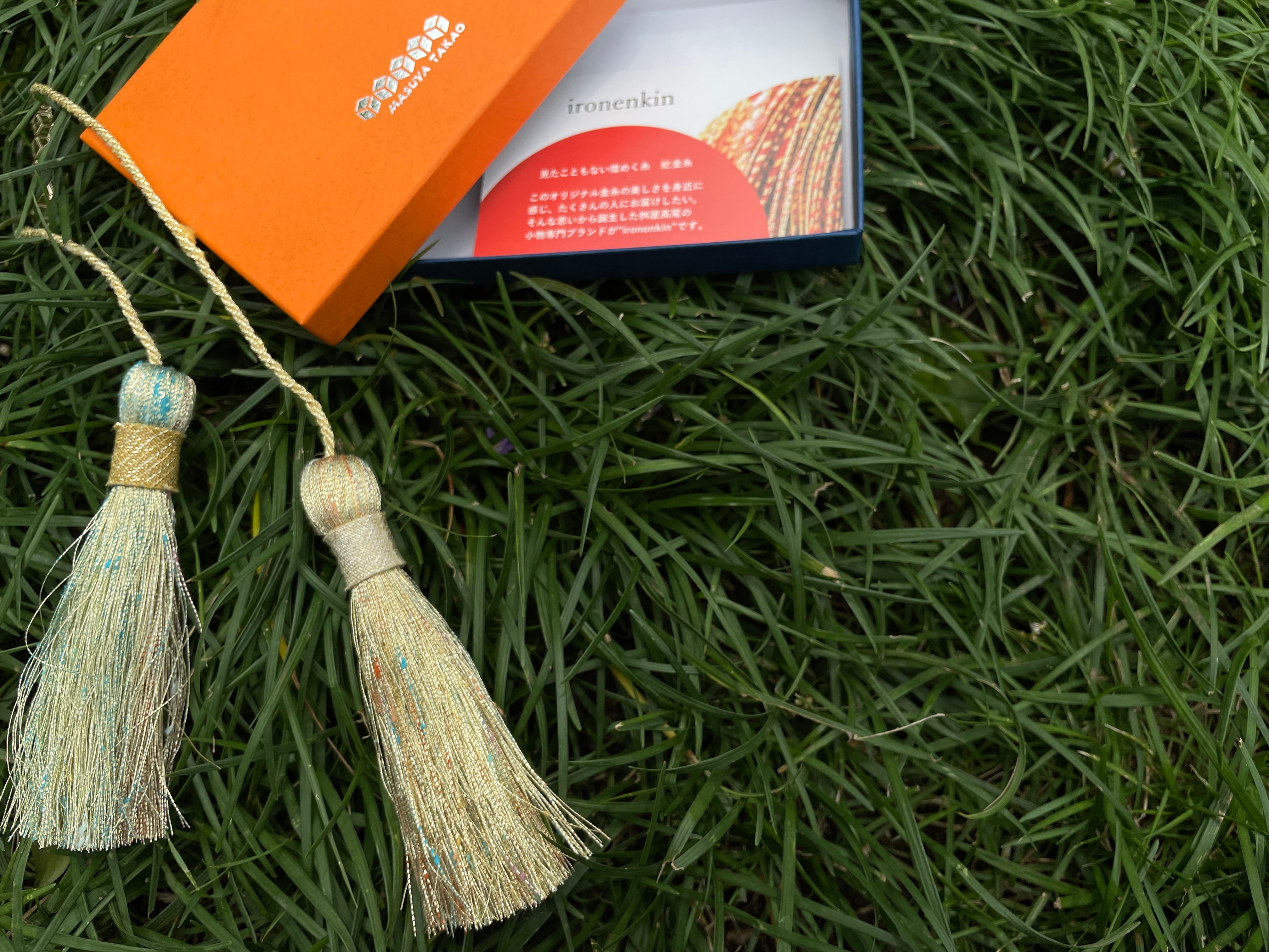 These exquisite twin tassels are crafted using "Nenkin" (Twisted Golden Thread), a remarkable material developed by Masuya Takao Co., Ltd., a company with a 90-year history in the production and wholesale of Nishijin-obi sashes. This unique thread revives the threads once used in the treasured textiles of the Owari Tokugawa family, created by wrapping delicate layers of gold leaf or lacquered foil around vibrantly dyed silk floss. Each thread shimmers with brilliance and changes its expression depending on the light, offering a luxurious touch to any item it adorns.