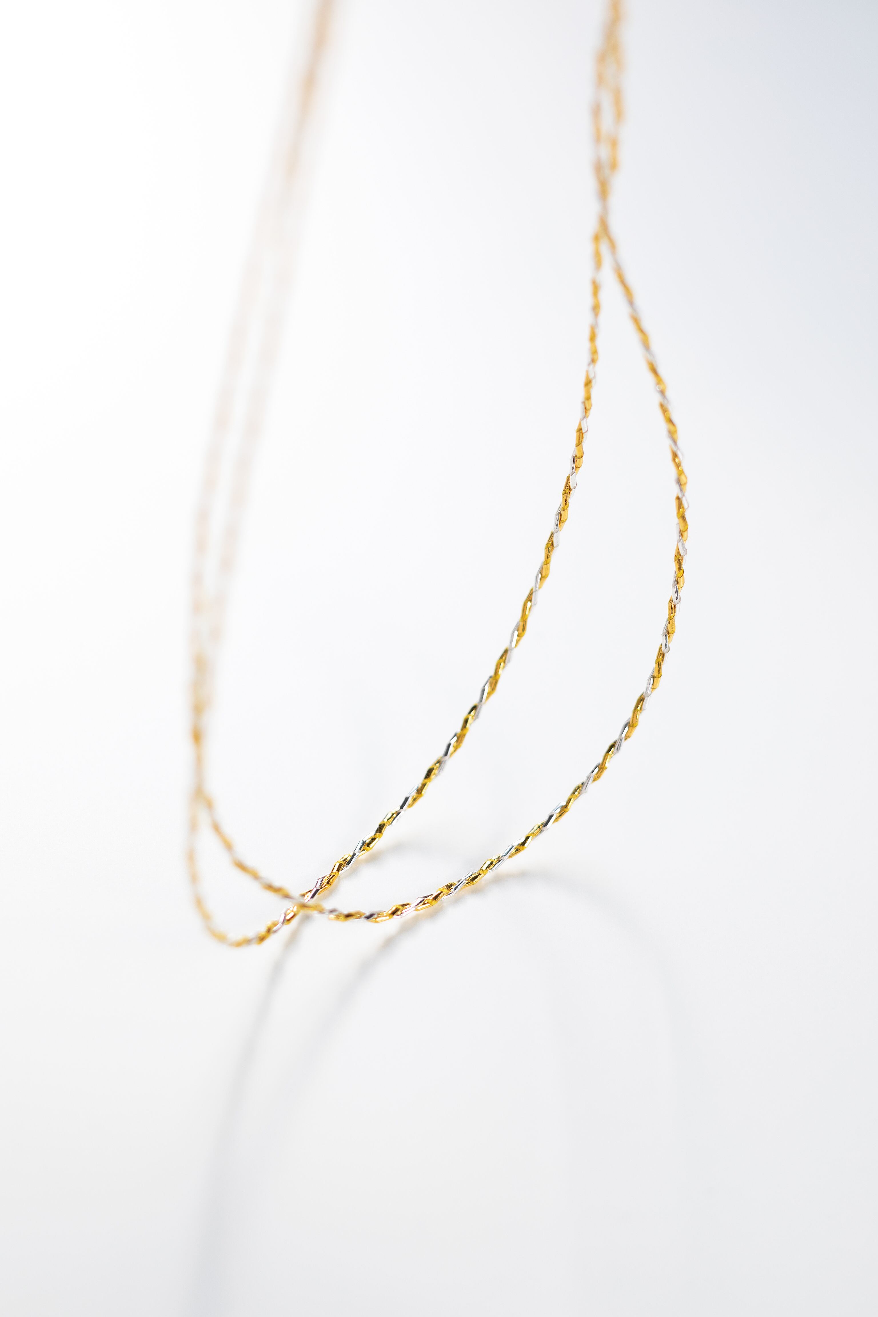 tabaneの純金糸と純銀糸ネックレスは、繊細な美しさと軽やかな着け心地が魅力のアクセサリーです。本物の純金糸と純銀糸を使用し、日本の伝統工芸技術で仕上げられたこのネックレスは、特別な日から日常まで、どんなシーンにも美しく調和します。